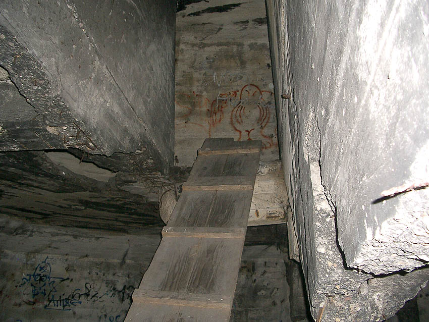 Die erste bis sechste Ebene des Turmes könnte mutmaßlich unterschiedlich zum Turm Norderneystraße aufgeteilt gewesen sein. Es könnte sein, dass hier die Ebenen in jeweils vier Raumzellen aufgeteilt gewesen waren. Hier wie auch auf den Fotos weiter oben zu sehen sind mutmaßliche Reste einer Trennwand an der Decke. Es kann aber auch sein, dass dies lediglich Deckenverstärkungsträger waren. Einige glatte Bereiche an den Resten deuten darauf hin...