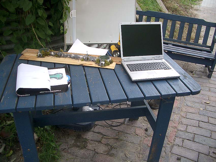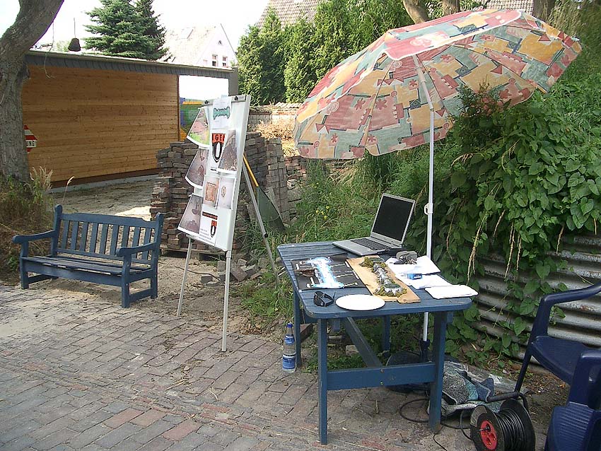 Der Igel-Infostand, mit Laptop, Flipchart, Modell, Fotos, Skizzen und dem Igel-Mobil...