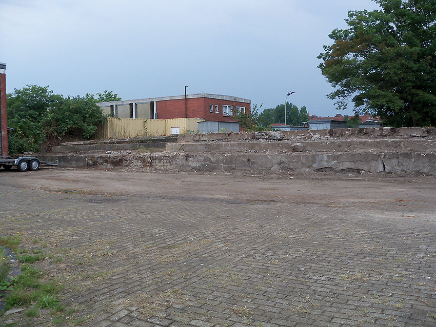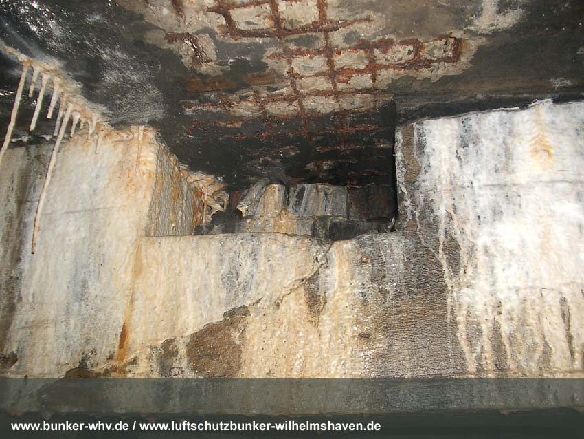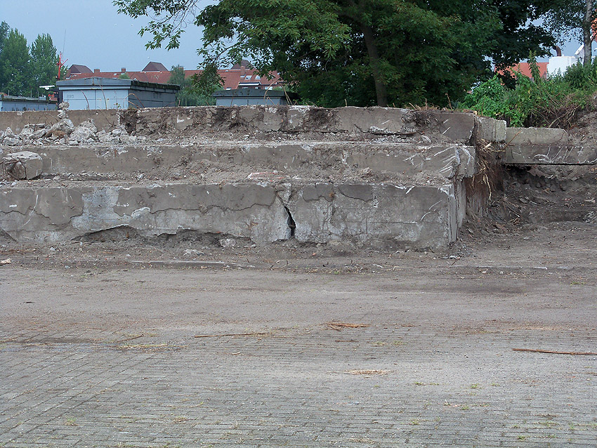 Nachtrag 14. Februar 2018 zum Tiefbunker: Die Anlage wurde am 10. Februar 2018 leergepumpt. Circa 600 qbm Wasser wurden abgesaugt. Während des eigentlichen Abrissbeginns (Bunkerdecke) wurde festgestellt, dass die Wände circa 1,80 Meter stark sind und die Decke etwa 1,50 Meter Stärke misst. Die Art der Bewehrung in Wand und Decke konnte bisher nicht ermittelt werden. So wie auch im Inneren die Oberbereiche der Wände zur Decke hin in circa 45 Grad-Schräge verstärkt wurden, findet sich auch außen um die Bunkerwände herum die Weiterführung dieser Verstärkung. All diese Bereiche sind mit einer Mauerwerksschicht versehen worden, um bei Nahtreffern im Erdreich eine Pufferung des Drucks (Verdämmungseffekt) herbeizuführen. Die leicht abgeschrägte (Regengefälle) Bunkerdecke und auch die Wände (unter dem Mauerwerk) sind komplett bitumiert. Der Bunker soll bekanntlich einen Bombeneinschlag erlitten haben, woraufhin dann die Decke mit Spannbetonträgern verstärkt wurde. Der Einschlag dürfte im Bereich / nördlich vom Eingang Süd stattgefunden haben. Hier sind alte Unebenheiten auf / in der Decke zu sehen. Der Eingang Süd, der die gleiche Form und Ausrichtung wie Eingang Nord hatte, ist im Unterbereich noch immer vorhanden geblieben. Der Eingangsvorbau wurde bis unter Erdgleiche abgetragen. Der Zugang selbst ist verschüttet worden. Eventuell geschah das schon im Krieg nach dem Einschlag. An der Nordostecke ist ein gemauerter Schacht mit Steigeisen am Bunker vorhanden. Dies könnte der Rest eines Eingangs 3 (Notausstieg mit Turm) sein. Im Gegensatz zum ersten Eindruck sind die Folgen der innerlichen Nachkriegssprengung äußerlich doch recht überschaubar geblieben. Auch die Bunkerdecke selbst weist fast keine Schäden dieser Sprengung auf deren Dachfläche auf.