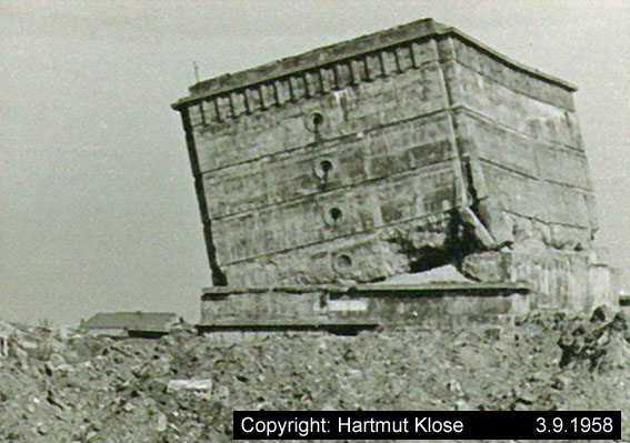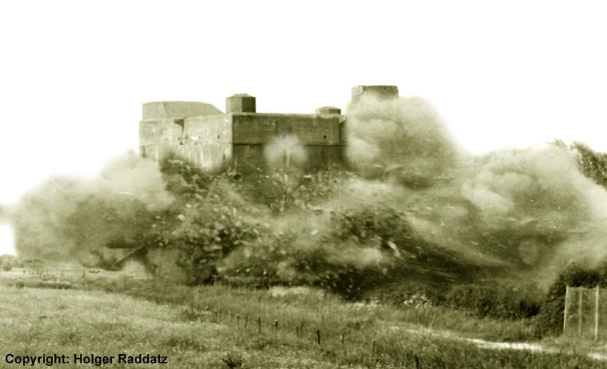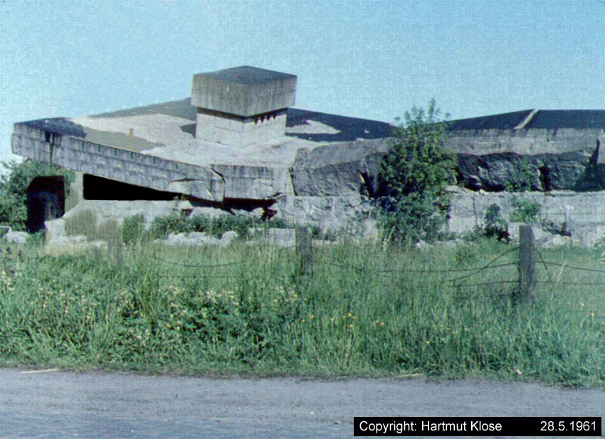 Aufnahmen des gesprengten Artilleriebunkers. Im Vordergrund ist auf dem obersten Bild ein gesprengter Kleinbunker erkennbar. Dieser wurde bald nach der Aufnahme des Fotos entfernt. Im untersten Bild ist der Bunker in den 1960er Jahren während des endgültigen Abrisses erkennbar. Aufnahmen aus den 1950er Jahren, 1958 und aus den 1960er Jahren.