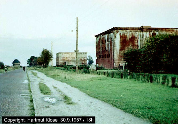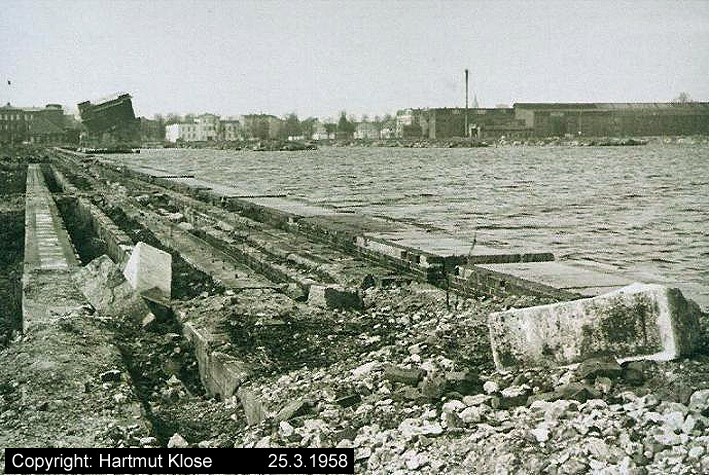 Aufnahmen aus dem gesprengten Artilleriebunker hinaus auf das ehemalige Bauwerftgelände. Im Hintergrund zu erkennen der ebenfalls gesprengte Befehlsbunker. Beide Bunker wurden entfernt. Heute ist dies der Standort des Marinearsenals. Aufnahmen aus den Jahren 1957 und 1958.