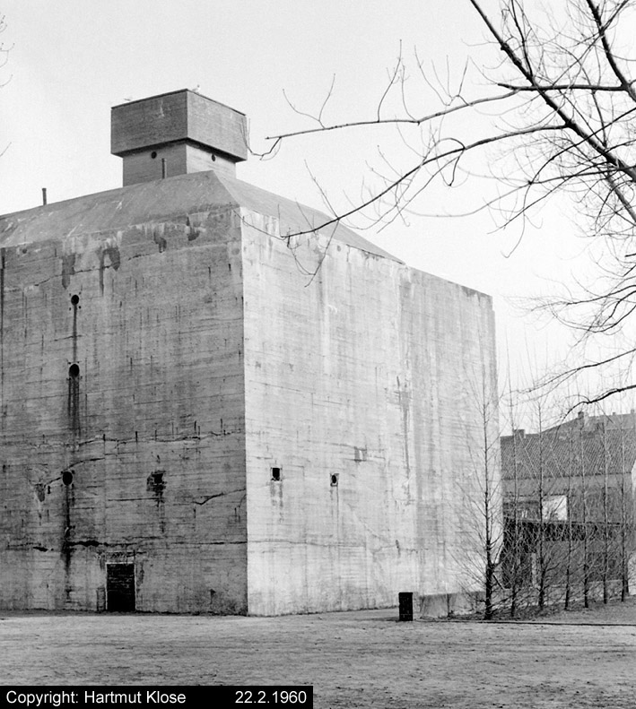 Aufnahme des entfestigten Hochbunkers Kantstraße. Mitte 1966 bis Anfang 1967 wurde der Bunker zum Wohnhaus umgebaut. Aufnahme aus dem Jahre 1961.