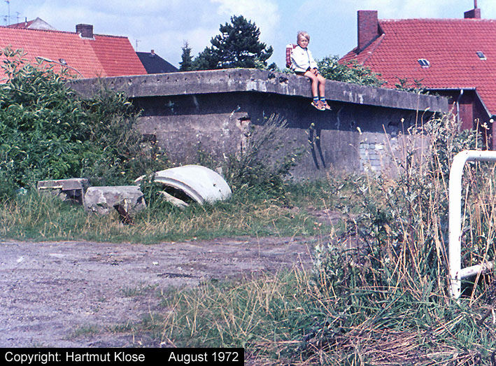 Aufnahme eines Kleinbunkers. Dieser Bunkerunterstand unweit nördlich der Flakstellung "Tirpitzschleuse" wird den Munitionsbunker der Anlage dargestellt haben. Auf jeden Fall wird das Objekt zur Stellung gehört haben. Genau wie die Stellung wurde der Bunker in den Nachkriegsjahren entfernt. Aufnahme aus dem Jahre 1957.