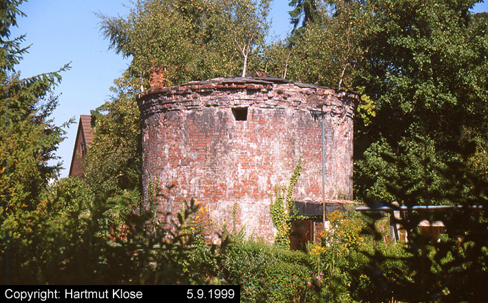 Aufnahme des verklinkerten kleinen Rundturmes an der Ziegelstraße. Der Bunker ist noch immer vorhanden. Aufnahme aus den 1980er Jahren.