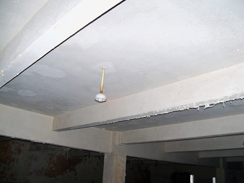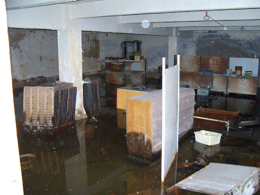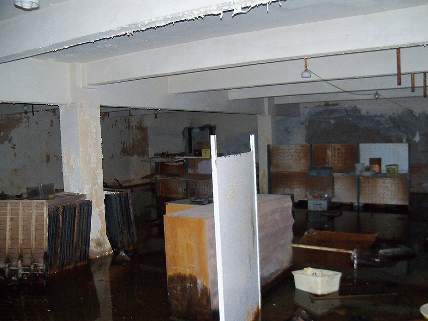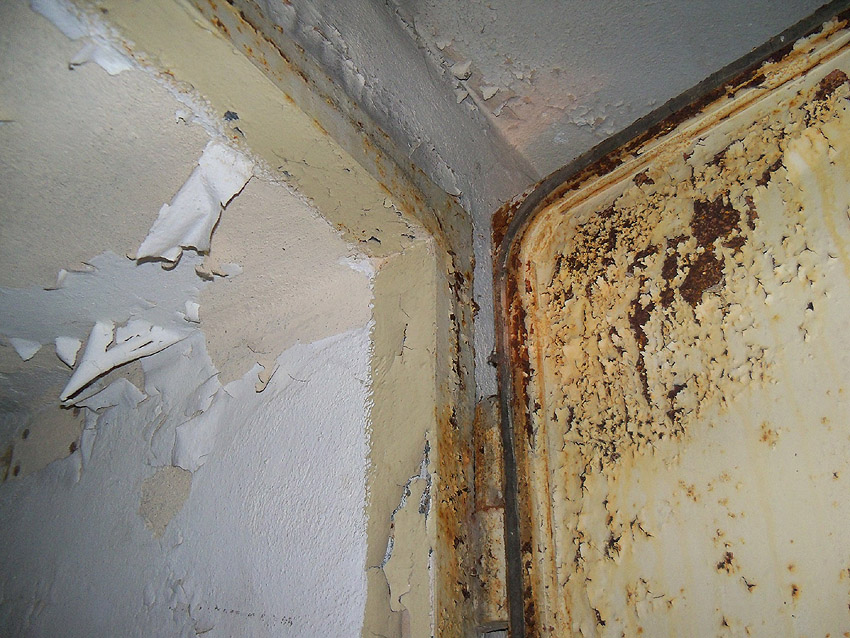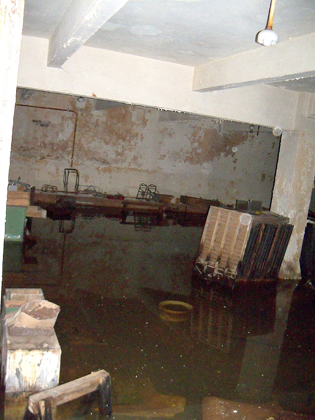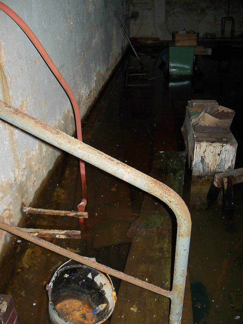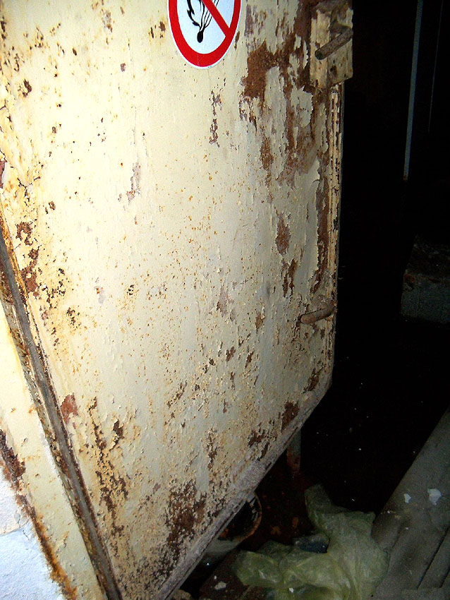Beachtlich sind die beiden mit Beton umkleideten / verstärkten Stahlträgersäulen. Diese Maßnahme geschah, um dem Raum weitere Stabilität zu verleihen. Hinten links befindet sich der zweite, rückwärtige Eingang in den Keller. Dies wird der ehemalige Notausgang gewesen sein. Er führt fast direkt in das Erdgeschoss des Wohntraktes / Bürotraktes. Dort sind allerdings keinerlei LS-Spuren (mehr) erkennbar...