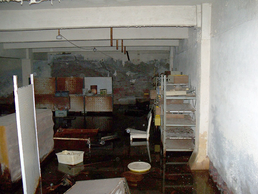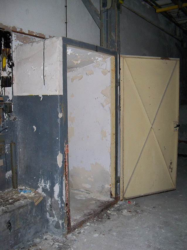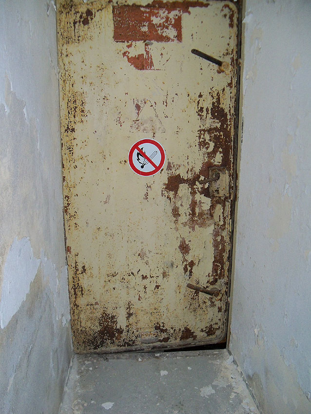 Blick durch die oben erkennbare rückwärtige Tür in den dortigen nach links verlaufenden Vorkeller und den ehemaligen LS-Raum selbst. Dort im Hintergrund links ist wiederum der oben abgebildete Hauptzugang erkennbar: