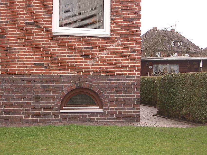 Wilhelmshaven / Kurpark / Bremer Straße 15 (im Hindenburgtor) / im Jahr 2023 erhalten (im Kellerfensterschacht dürfte sich im Krieg ein Mannesmann-LS-Gitter befunden haben / der geklinkerte Rand wird nach Ausbau des Gitters gefertigt worden sein)