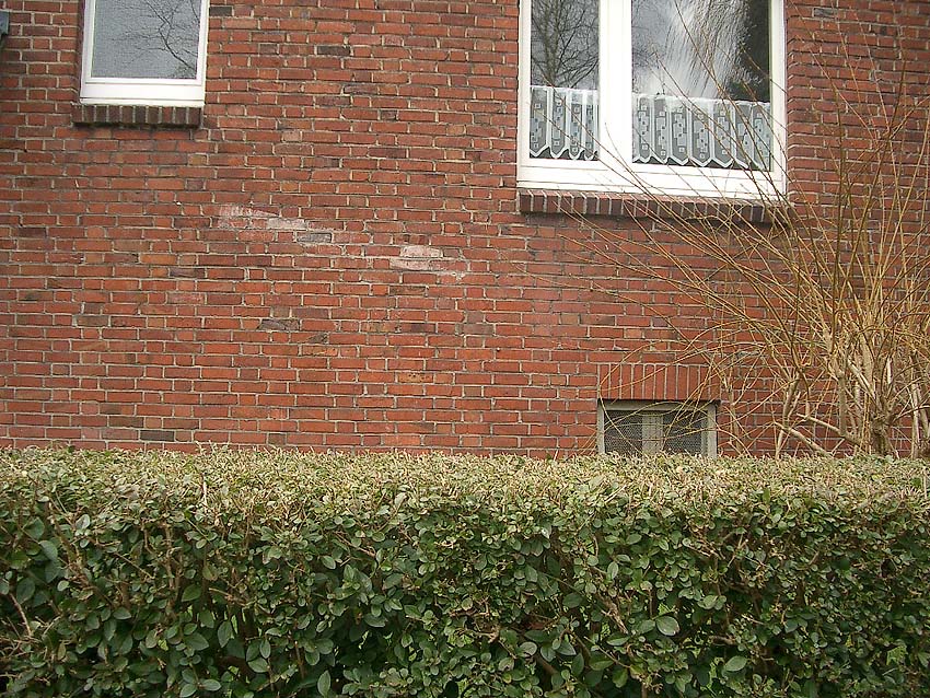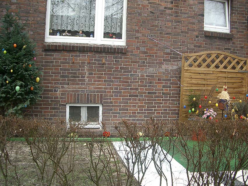 Auch vor den nachfolgend abgebildeten ehemaligen LS-Kellerfenstern waren wie vor diversen anderen Kellerfenstern im Stadtgebiet Betonblöcke gelagert worden. Sie sollten Schutz vor Detonationsdruck bieten. Auch auf den nachfolgenden Bildern sind Reste der Putzfugendichtung teilweise noch gut zu erkennen...